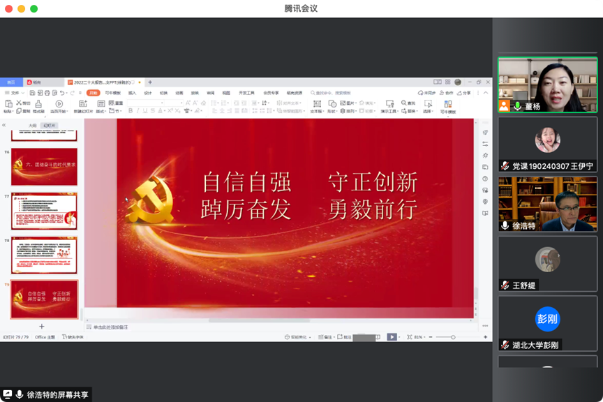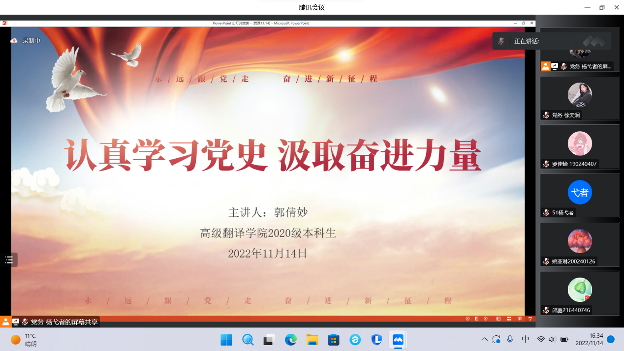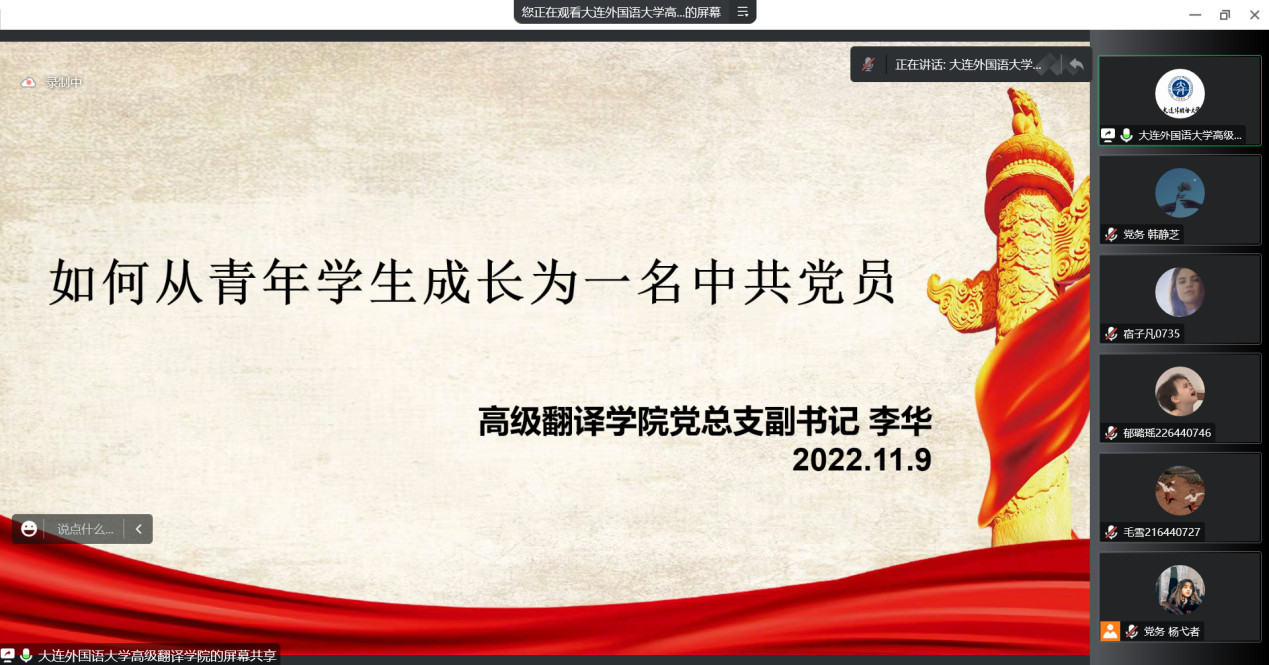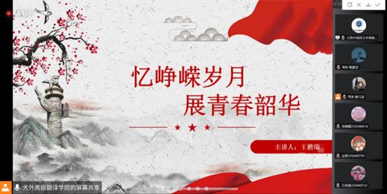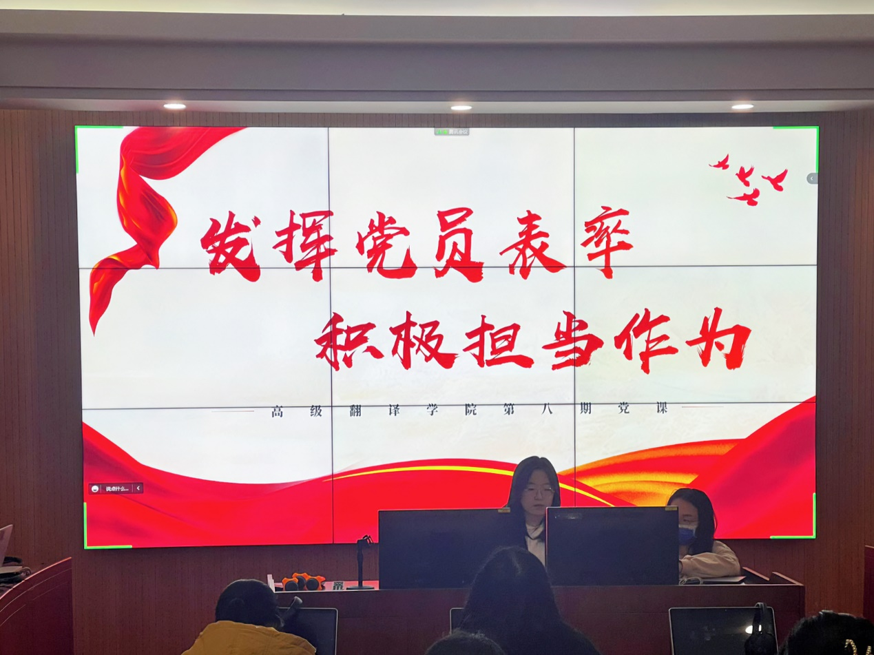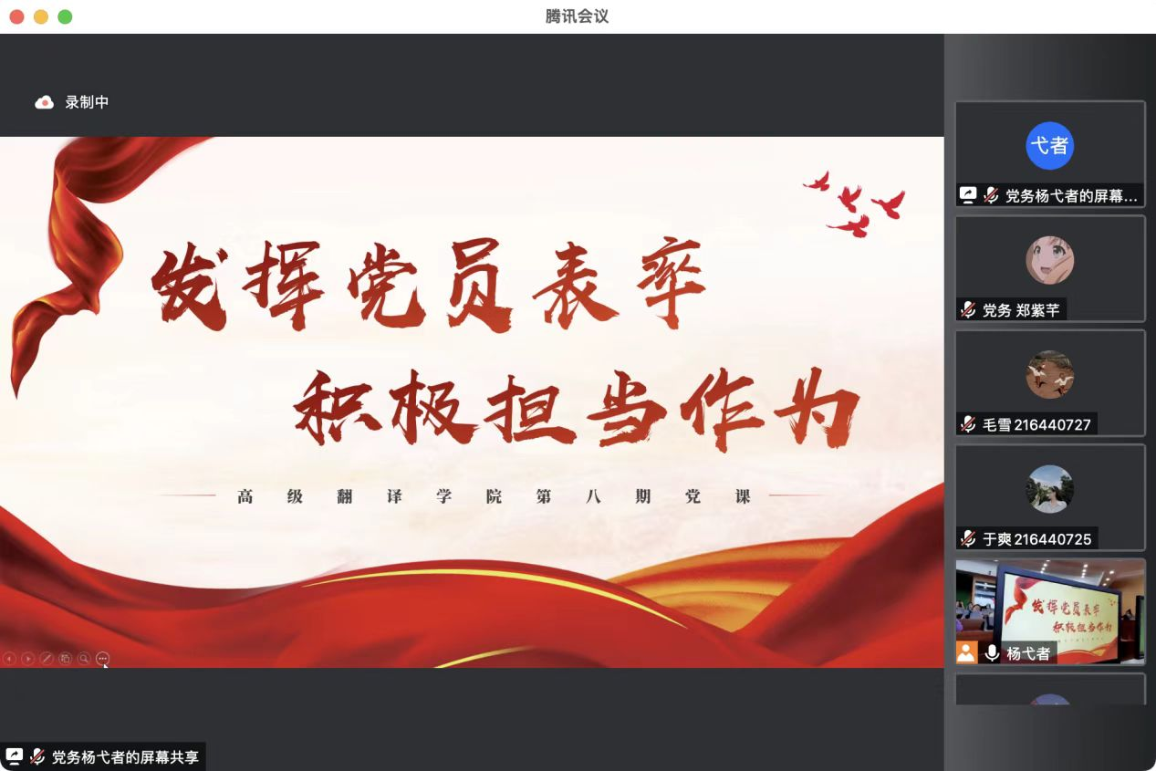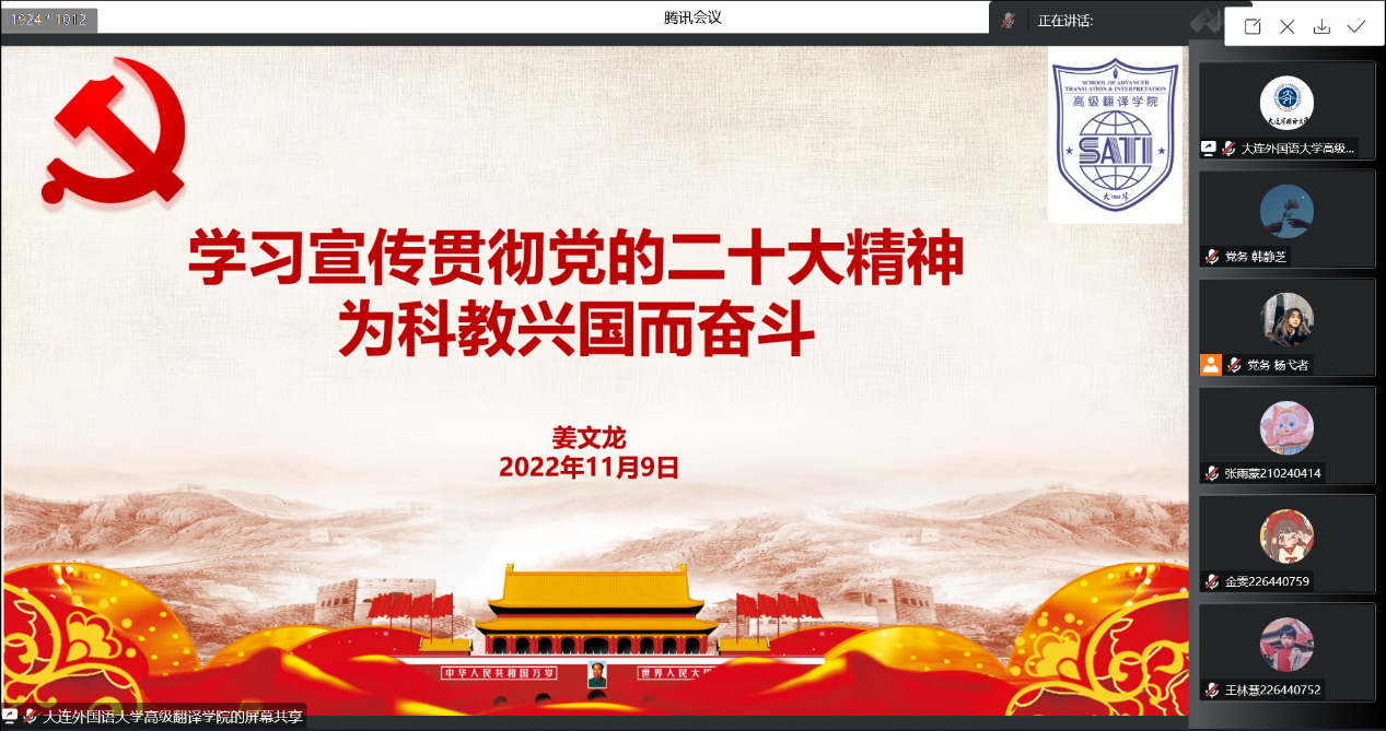 本次党课使同学们更加明确了身为翻译人才肩负的责任与使命。日后我们也将更加刻苦的学习,提高自身的知识储备和水平,贯彻科教兴国战略,讲好中国故事。在重大的舞台上施展才干,成为全面建设社会主义现代化国家,全面推进中华民族伟大复兴的生力军和后备力量。