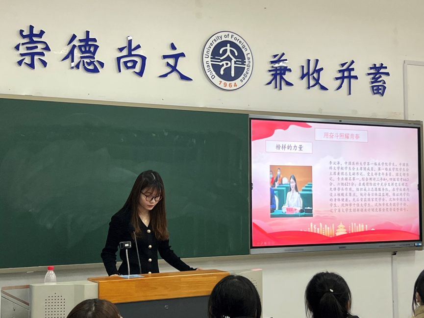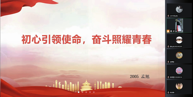 首先,孟旭向大家强调了党的自我革命精神之重要性,强调了现阶段各位积极分子需要不断地进行反思和自我总结,并且需要通过定期写思想汇报的方式向党组织报告自己的情况。接着,孟旭通过抛出“中国共产党人为什么而奋斗?”这个问题引发大家的思考,进一步深化了大家对中国共产党人“为中国人民谋幸福,为中华民族谋复兴”的初心使命的理解。最后,孟旭给大家展示了辽宁省优秀大学生人物代表、优秀大学生党员代表事迹,让大家在榜样的熏陶下提升思想觉悟、奋勇前行。