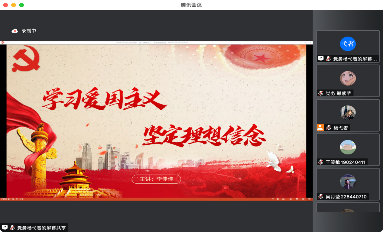 于励业楼502教室以线上线下相结合的形式召开主题为“学习爱国主义,坚定理想信念”的入党积极分子党课第十讲,本次党课由优秀预备党员李佳佳主持召开。