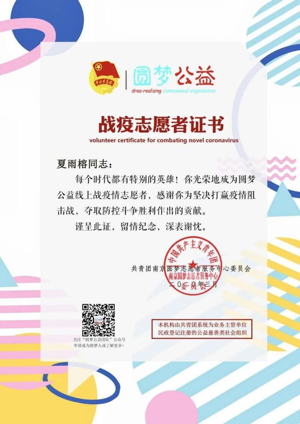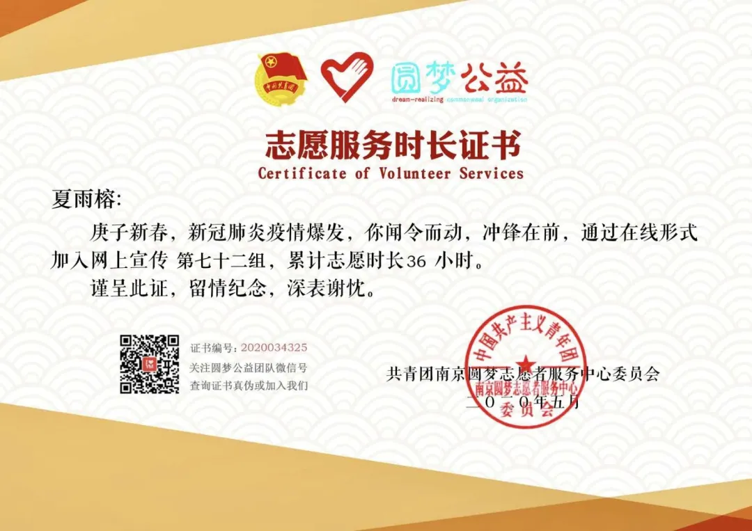 2020年新年伊始,新冠肺炎疫情的爆发牵动了全国人民的心,各行各业的人们都在贡献着自己的力量,共同帮助武汉、帮助湖北、帮助中国渡过这场难关。在这场抗疫斗争中,我有着不同的身份,一是助力者的角色,因为我的妈妈作为安徽省安庆市疾病预防控制中心一线疫情信息报告组组长,每天需要即时登记和汇总感染人数和密切接触者人数,所以会接触到各类人群的详细信息,在遇到由境外输入的病例信息时,我就会帮助她进行一些简单的翻译。而在疫情严重时,我作为一名共青团员,也参加了共青团南京圆梦志愿者服务中心的志愿者活动,共计36小时,每天在线统计战疫人数和情况,制作海报和视频在公众面前宣传防疫知识和疫情现状,使得身边的亲人和朋友不恐慌不焦虑,正确应对疫情,并且还为战疫先锋人物和事件撰写宣传文案。虽然没能亲入抗疫一线,但是线上的工作也让我感到无比充实,我切身参与到了中国抗疫的持久战。