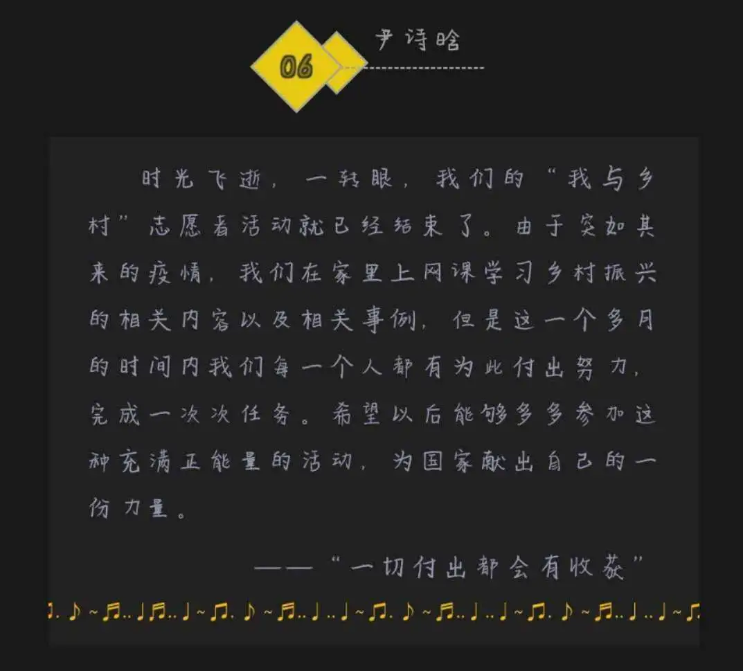 的指导帮助下,青年学生学习到乡村振兴战略、“三农”工作的重要性、新冠肺炎疫情下的乡村/城市建设等实际社会问题。学习过程中,学生们更深入地了解到了国家及其所在地的疫情情况,增强了爱国主义精神和坚定不移奉献祖国的信念,并致力于寻找到适合自身身份、能力、责任的志愿服务及工作岗位。