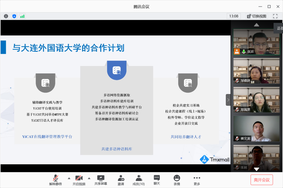 的宣传介绍片后,双方针对合作流程、新项目开发与学生实习实践等多方面的内容进行了交流,涉及实习过程和实习要求等细节问题。张总表示,一者科技坚持为热爱翻译事业的人才创造发展的机会,公司将在双方的合作中提供技术支持,接收学校向企业推荐的师资及专业人员,并在世界范围内推广合作所得的优秀翻译技术。同时,针对大连外国语大学的语言优势及一者科技对于多元人才的需求,双方在沟通中达成共识,希望以此次会谈为契机,加深多语种翻译技术支持下的校企合作。