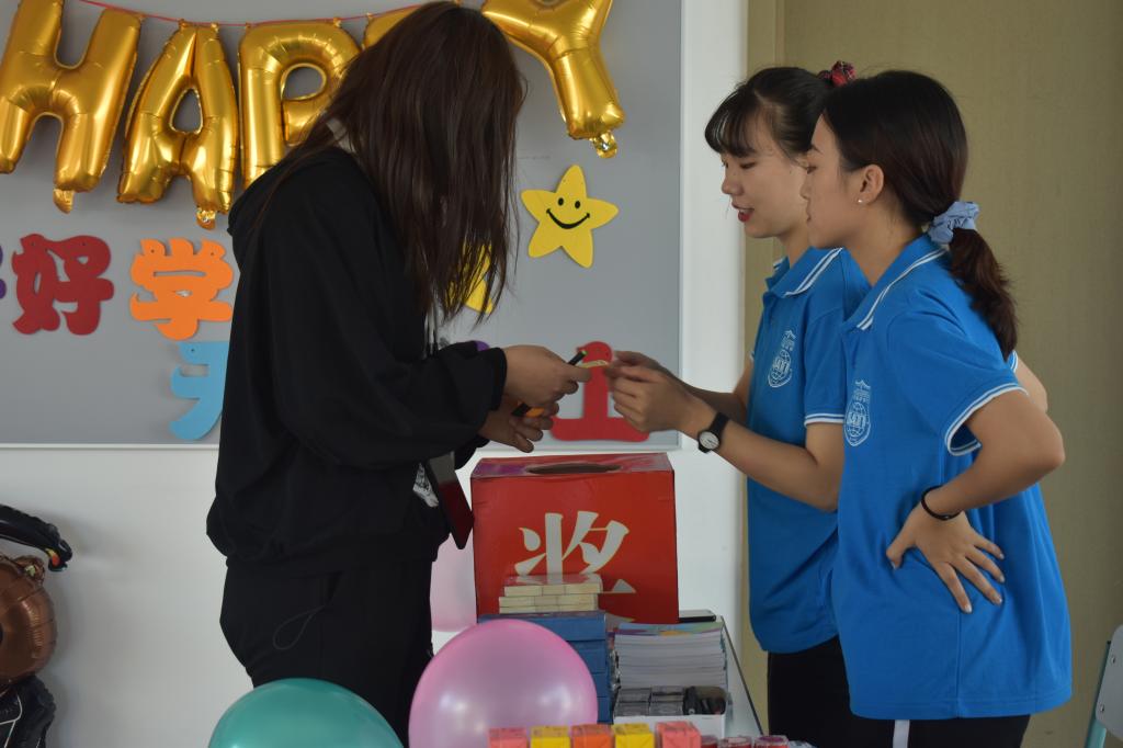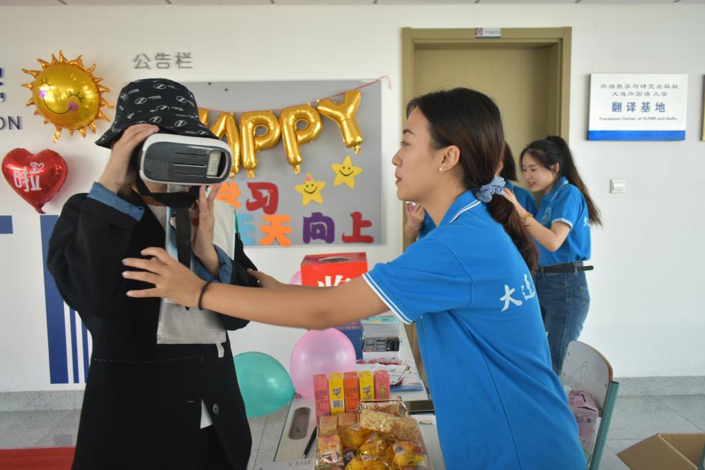 于励业楼设置了高翻宣传板向同学们介绍高翻特色,展示高翻成就。同时,分团委学生会也组织了“翻然归去初心依旧,译海扬帆只待君来”打卡签名活动,设置了抽奖赠礼环节,并为每一位新生提供高翻定制精美礼品。迎新现场,同学们还利用VR设备观大外全景,用拍立得记录报道时刻。