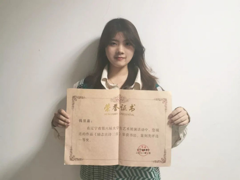 致力于打造书香校园,让学生在书法魅力中弘扬中国传统文化。2019级钱昱嘉艺心画栋,在辽宁省第六届大学生艺术展演活动中,报送的作品《励志古诗三首》荣获书法、篆刻类评选一等奖,展现了高翻学子对传统文化的热爱与弘扬。