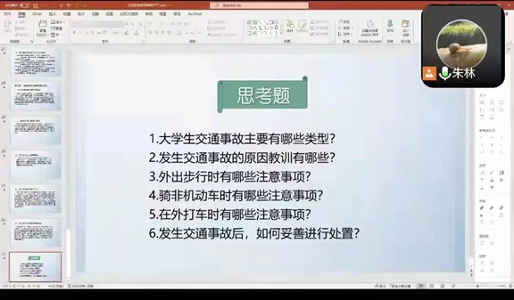 会议开始,朱林老师以案说法,着重强调了交通安全与每一位同学息息相关,每一起交通事故的发生都会带来严重的后果,同学们务必保护好自身安全。接着,朱老师就大学生发生交通事故的主要类型、原因教训、防范措施及处置方法进行讲述,教育同学们要不断提高交通安全防范意识,避免事故的发生。王楷瑞老师也在详细介绍相关内容时表示大家要认真遵守交通规章,避免发生交通事故,万不可做“马路杀手”。