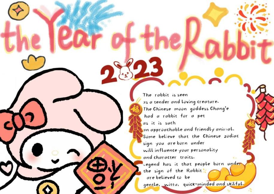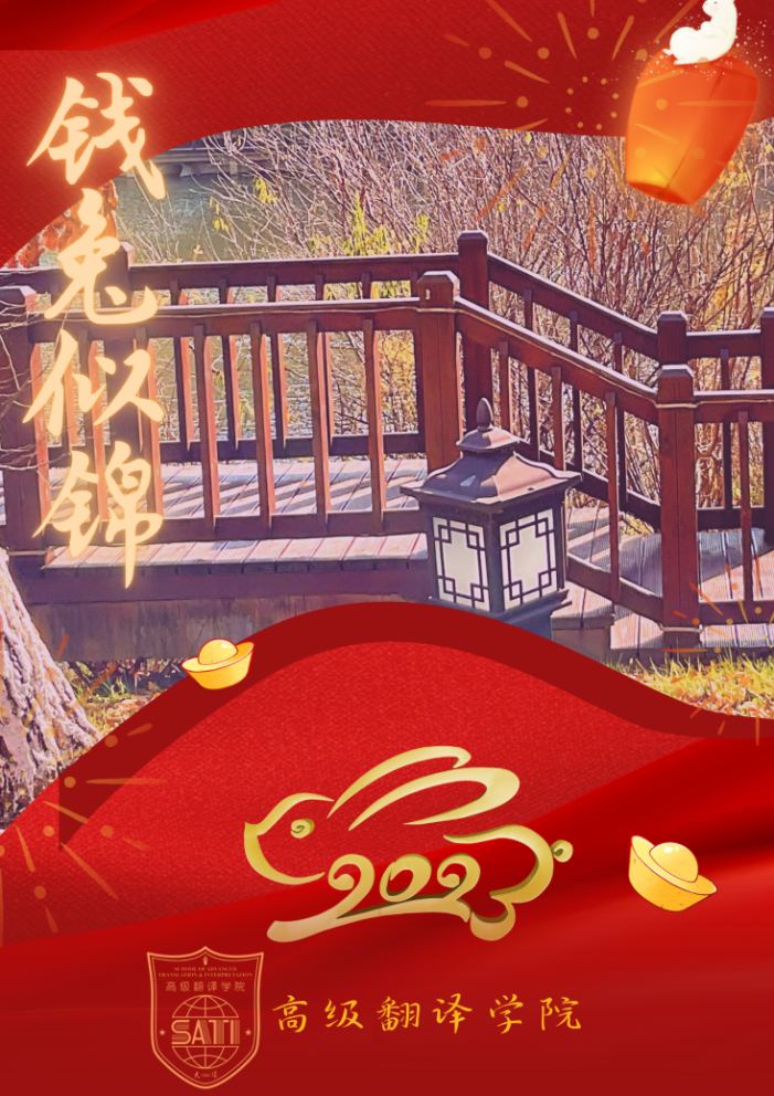 举办了“卯兔贺岁,送旧迎新”2023年新春贺岁主题活动来收集同学们的欢乐和热情。现如今,春节文化丰富多彩,各式各样的年俗也让春节文化变得丰富立体了许多。随着时代的进步,年俗的创新,我国传统节日正持续散发着文化魅力,高翻学子在本次活动中的积极参与更是让春节的浓浓年味在人们心中溢满飘香。不论是各具特色的海报,还是别出心裁的“福”字,都是同学们对新春的美好期盼与向往,现在就让我们一起来欣赏本次活动中的优秀作品吧!