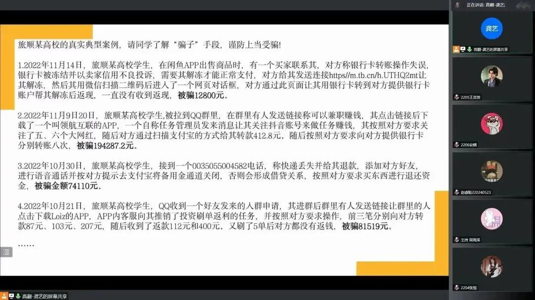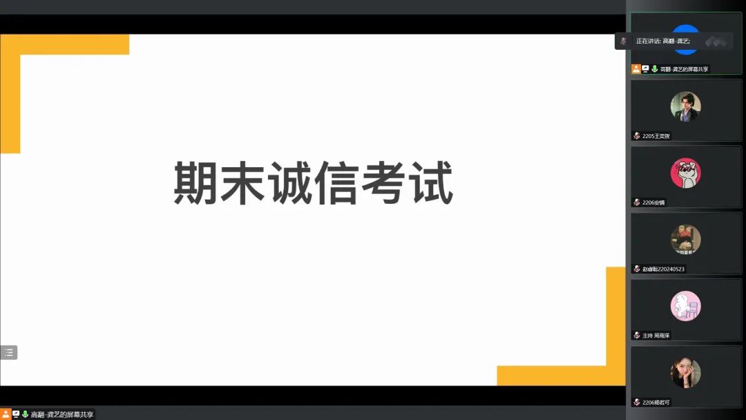 会议伊始,龚艺老师进行了学风教育及期末考试诚信教育。龚老师向同学们例举了违反考试规定的错误示范,提醒同学们在网课和线上考试中要重视学习效率与平时成绩,也要严格遵守考试纪律。随后,龚老师提醒同学们离校返乡途中以及寒假期间一定要做好安全防护及疫情防护,保护好人身及财务安全。其次,龚老师着重讲解了防诈骗知识。她向同学们介绍了近期发生的一些网络诈骗案件类型以及被骗学生的经历,提醒同学们提高警惕,谨防上当受骗。会议最后,龚老师对全体新生表达了殷切期望与美好祝愿,希望同学们在充实的假期生活中不断加强对专业知识的学习。