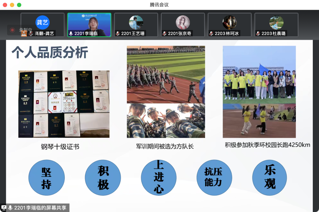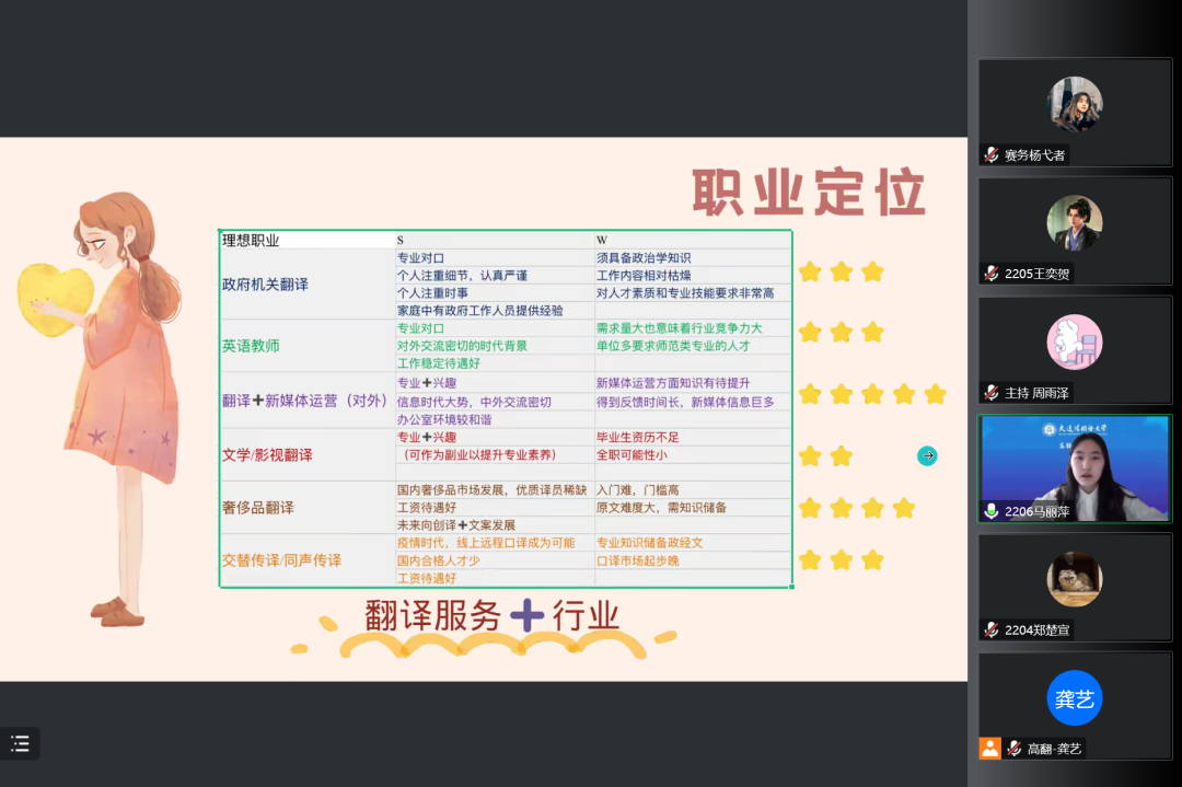 展示进行期间,25位选手能够充分将职业生涯规划课堂所学知识运用到实践中,应用霍兰德职业兴趣测试、MBTI职业性格测试等工具,结合自身成长历程、工作经历、过往荣誉、亲友师长评价等综合分析自我,并在对自身性格、特长有了全面而充分的了解后,初步得出自身职业发展意向,在此基础上通过职业访谈、信息检索、数据分析等方式对目标职业进行衡量与评估,最后找到感兴趣且适合自己的职业,找出自身与职业需求间的差距,从而明确自己的奋斗方向,制定行之有效的努力方案。选手们在活动前精心准备,在会场上言谈举止得体、展示内容详实,言之有物、讲述过程逻辑清晰、声情并茂,充分展现了高翻新一代学子的精神面貌与绰约风采。