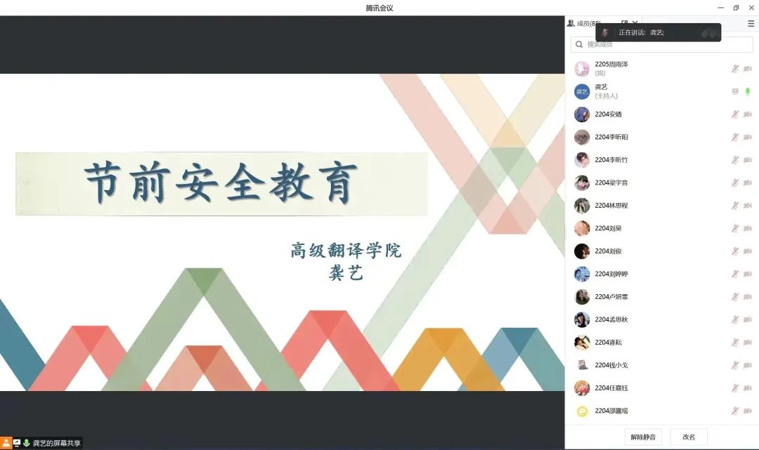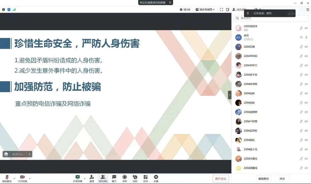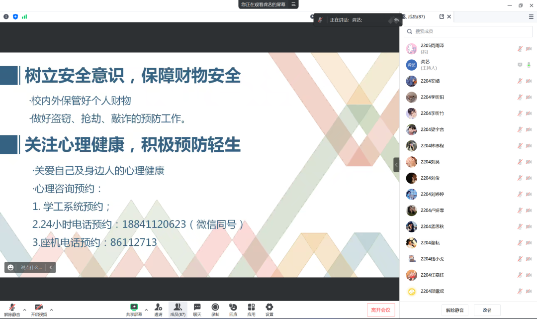 于线上召开了节前安全教育大会。本次大会是疫情结束后的首次节前安全教育大会,由分团委书记朱林老师,学生辅导员龚艺老师、王楷瑞老师主讲,各年级同学齐聚云端,参加本次会议。