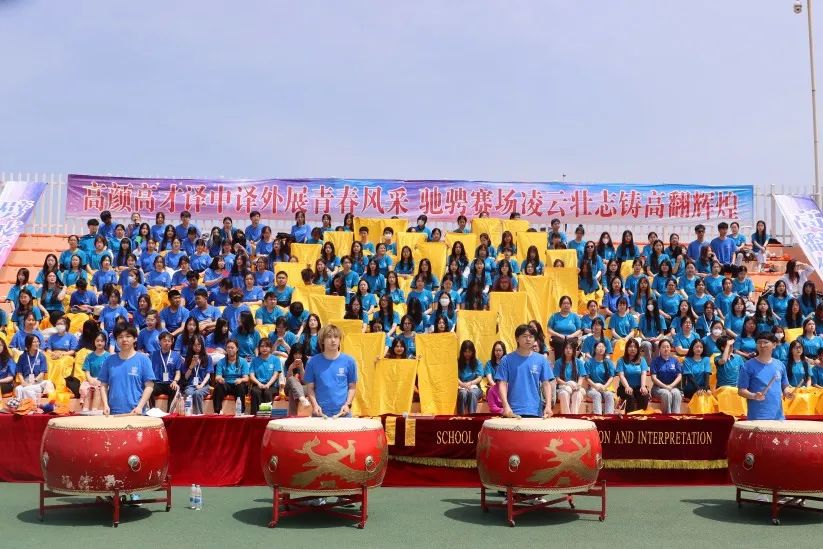 无与伦比的自信与一往无前的热情。与此同时,观众席的同学们也大声喊出口号,不断拼出“DUFL”、“SATI”、“HERO”、“GO”、“RUN”、爱心等图样,向校领导们展现高翻学子们热爱体育、力夺冠军的如虹气势,彰显高翻风姿。