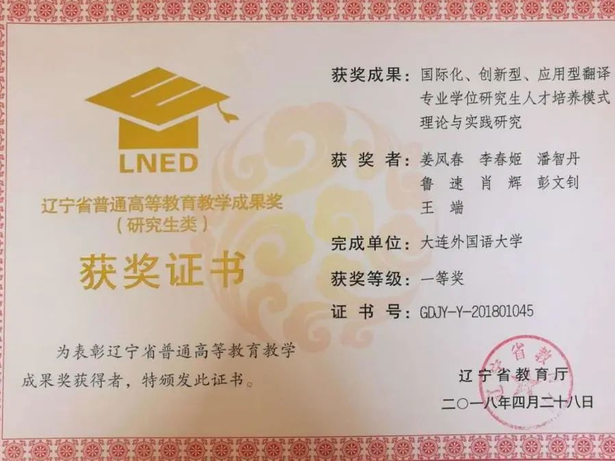 、英国兰卡斯特大学、英国布鲁奈尔大学、英国斯旺西大学、英国贝尔法斯特女王大学、美国蒙特雷国际研究院、美国波士顿大学等名校的访学经历。专业教师入选全国人大法工委法律英文译审专家、省百千万人才工程(百人层次和千人层次)、省高校优秀人才支持计划、省优秀专家、省教学名师、省“向上向善好青年”(爱岗敬业类)、省教学成果一等奖团队、省“黄大年式教师团队”。专业教师被聘为国家社科基金项目同行评议专家、教育部人文社科项目同行评议专家、全国翻译专业学位研究生教育指导委员会专家委员会委员、中国翻译协会理事(专家会员)、中国英汉语比较研究会语言服务研究专业委员会常务理事、辽宁省翻译学会会长、中国英汉语比较研究会翻译传译专业委员会理事、中国英汉语比较研究会社会翻译学专业委员会理事、中外语言文化比较学会话语译介与传播研究专业委员会理事、中国少数民族文学学会理事。