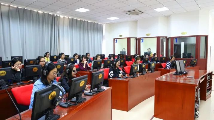 学生在数字化同声传译实验室进行口译实训
