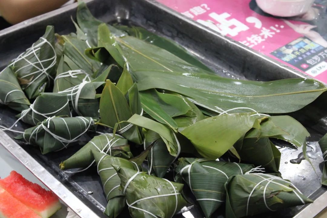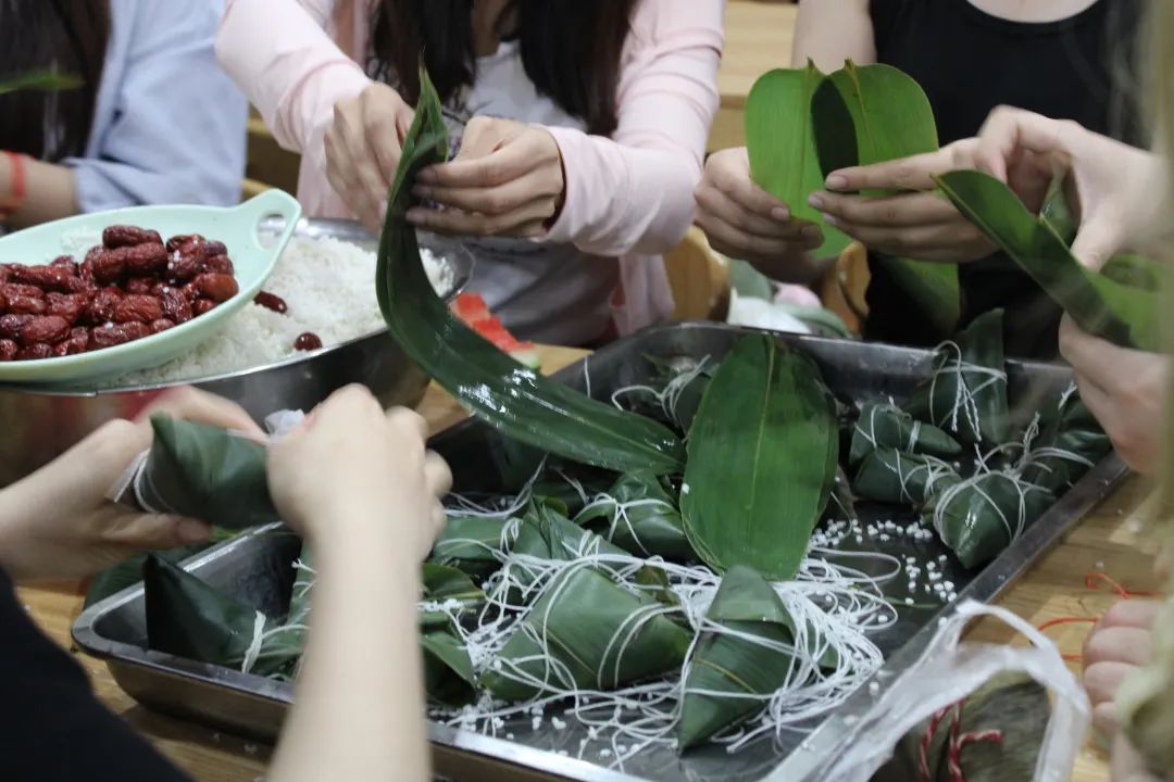 提前为同学们准备好了粽叶,糯米,红枣等多种原材料,并安排了工作人员为大家示范并讲解包粽子的方法。两片粽叶,一团糯米,一颗红枣,一根细绳......看似简单的食物,做起来却并不轻松。尽管经历几次失败,同学们依旧勇于尝试,并且互相交流包粽子的技巧。终于,在同学们的不断努力和工作人员的耐心指导下,一个又一个圆润饱满的粽子源源不断地在同学们手中诞生。现场充满欢声笑语,其乐融融。在经历了一个小时左右的等待后,由同学们亲手制作的粽子新鲜出锅,一瞬间,整个餐厅粽香四溢。