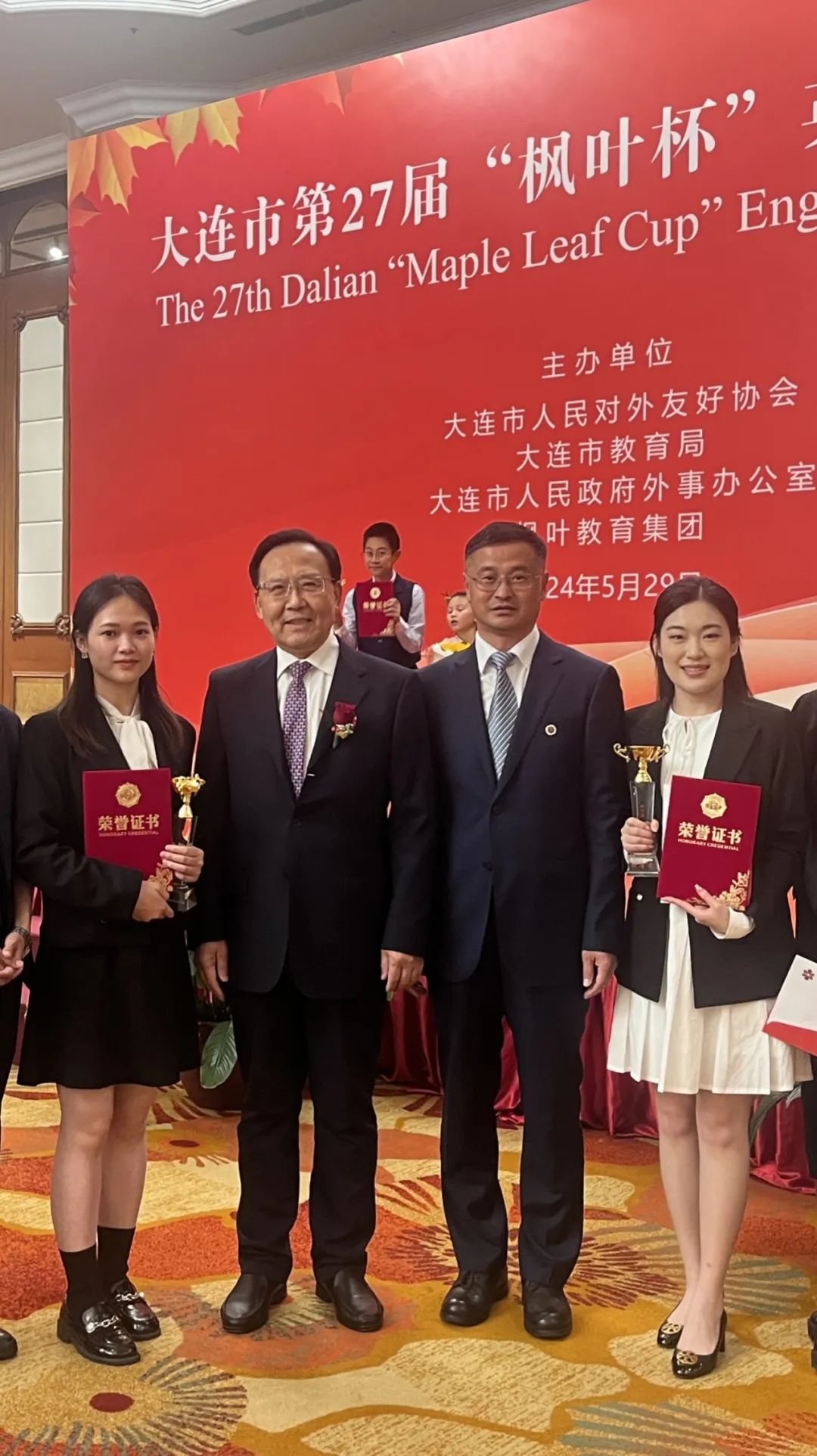 本届“枫叶杯”赛事于2024年4月27日正式开始,选手来自大连市各高校,分为初赛、复赛、决赛。初赛为命题演讲,复赛为现场即兴演讲。经专家评审,社会组共5名选手脱颖而出,晋级决赛。夏悦婷和邹馨两名同学分别以第一名和第五名的成绩晋级决赛。
