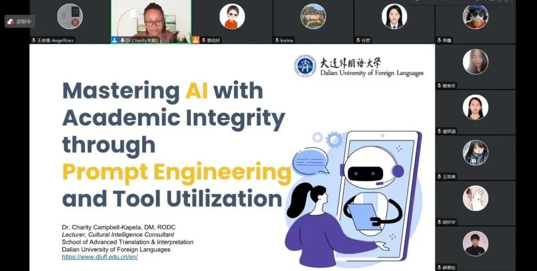 在讲座的准备阶段,Campbell博士与大家热情互动,调动同学情绪,确保大家能及时进入状态。讲座开始后,Campbell博士带领同学们探讨了AI在研究、写作和学习中的有效应用。在这之后,她强调了同学们应学习如何平衡AI的使用与伦理原则以及如何检测和避免AI驱动的来袭,让AI成为帮助大家学习语言的有力工具。讲座尾声,Campbell博士向同学们生动地演示了如何将AI技术融入课堂教学,并带领同学们一起体验了当下流行的AI工具。