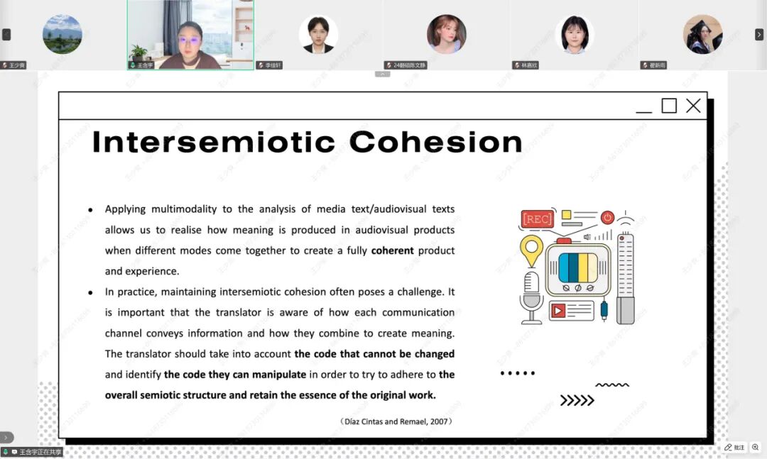 在理论阐述部分,王老师结合多模态翻译研究,系统分析了视觉、听觉与语言模态之间的“互指关系”,指出游戏翻译需在时间、空间与感官体验的多重限制中实现协调统一。她以足球类与角色扮演类游戏为例,说明字幕、配音与画面的同步关系对翻译决策的制约,并提出“游戏翻译的双向交互性”概念,强调译者既要理解玩家输入,也要把握系统反馈,从而实现沉浸式交际体验。