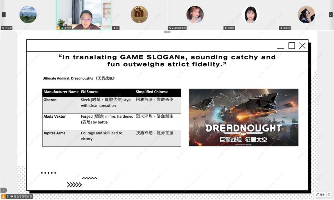 在案例分析环节,王老师分享了多个典型实例,剖析了游戏翻译中常见的误区与改进策略。她指出,过度修辞、语体失衡或文化误读都可能削弱译文可读性和玩家体验。通过对标语、人物对白与诗歌文本的分析,王老师展示了如何在忠实原意与创意再现之间保持平衡。例如,将“单抽卡”译为“召唤礼券”既符合游戏语境,又增强了玩家的代入感。