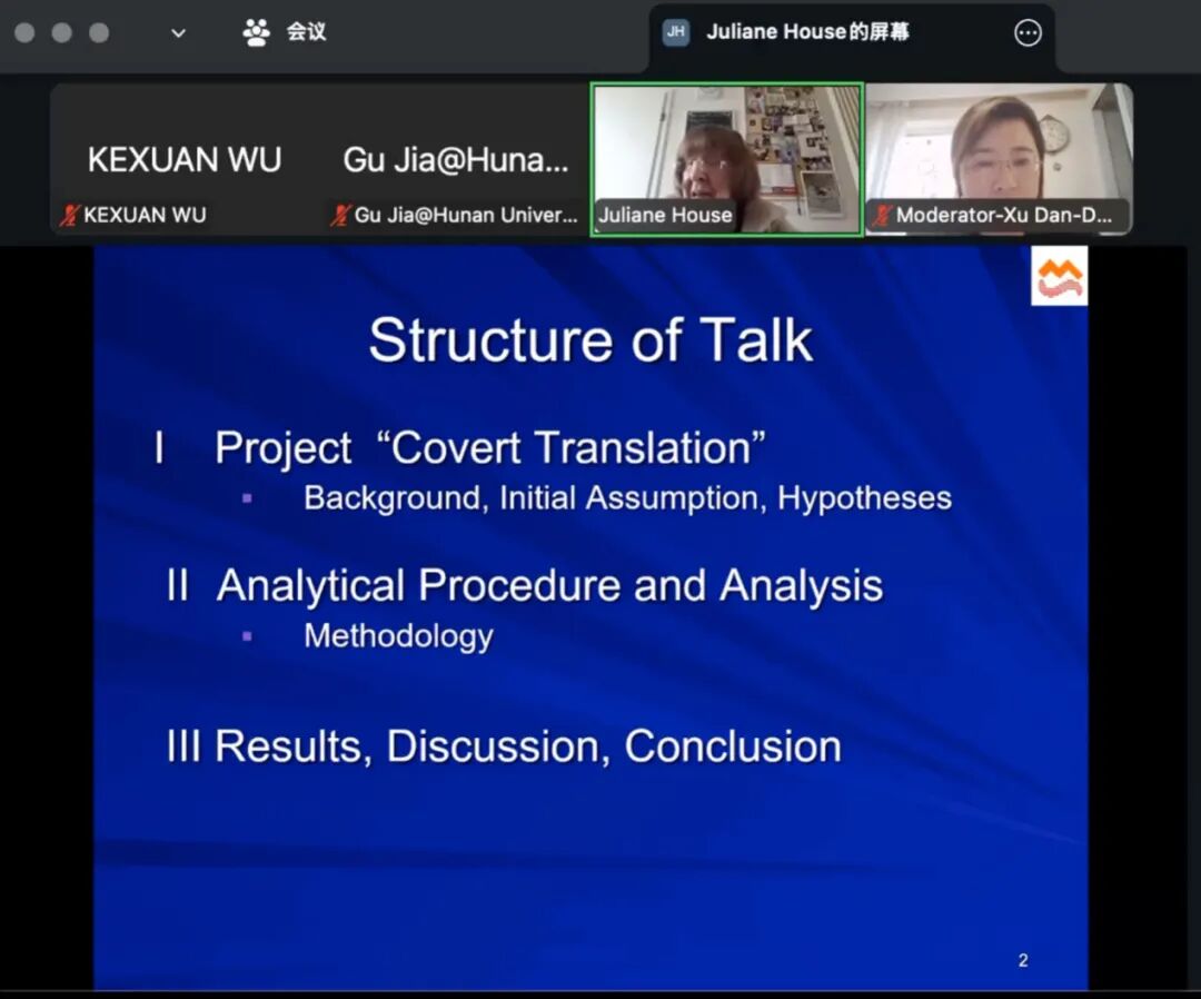 讲座中,House教授系统阐述了她主持的一项历时十二年的德国科学基金会重点研究项目。她指出,在全球化的今天,英语作为主导性通用语,正通过隐性翻译显著影响德语的交际规范与语言习惯。为了验证这一假设,她的团队构建了包含英语、德语原创及翻译文本的多语言历时语料库,并创新性地结合了定性分析、定量统计与再语境化检验的三重研究方法。