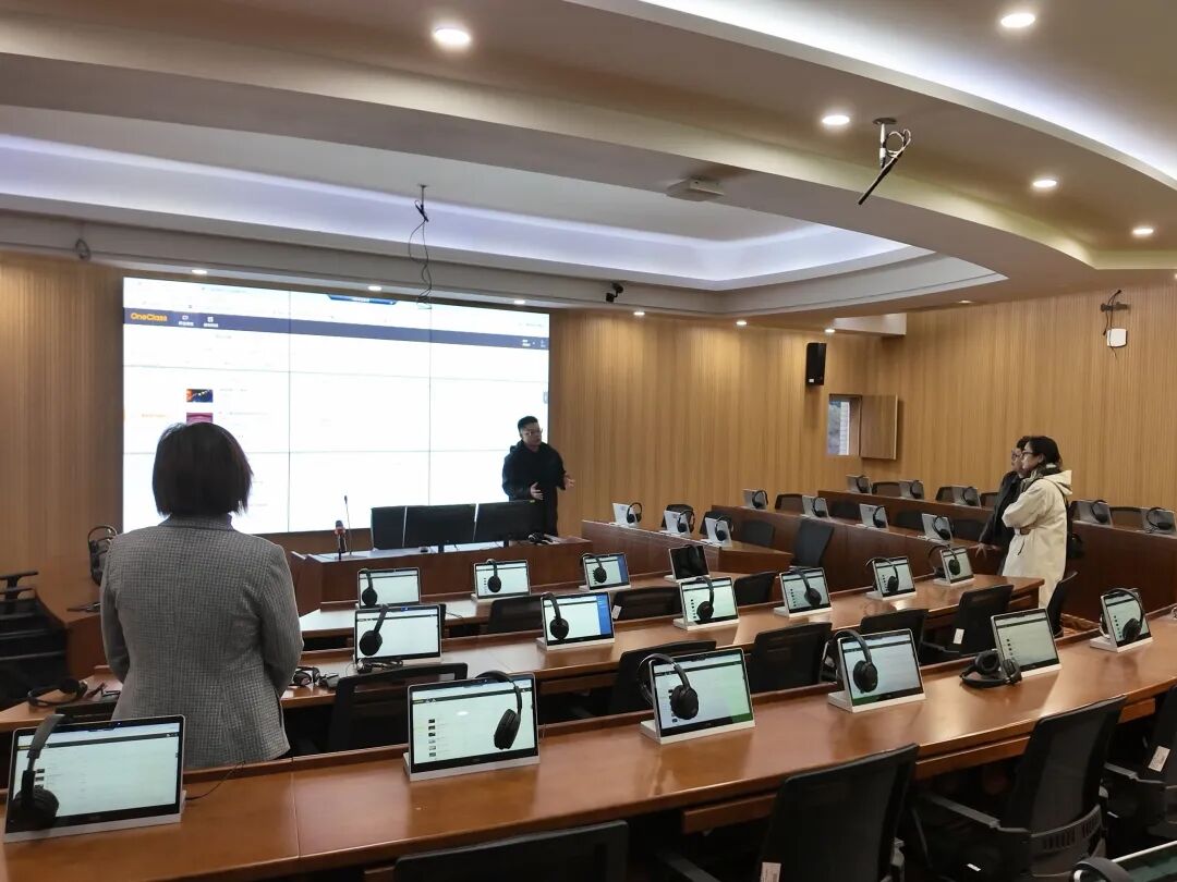 相关负责人向对方介绍了其核心建设的两大组成部分:涵盖单人间实训室、VR实训设备等在内的现代化硬件设施,以及基于大学教学平台、配备AI听说训练资源的信息化系统。在沉浸式体验教学环境后,来访院校领导对中心设备的便捷性与体验感给予了充分的肯定。