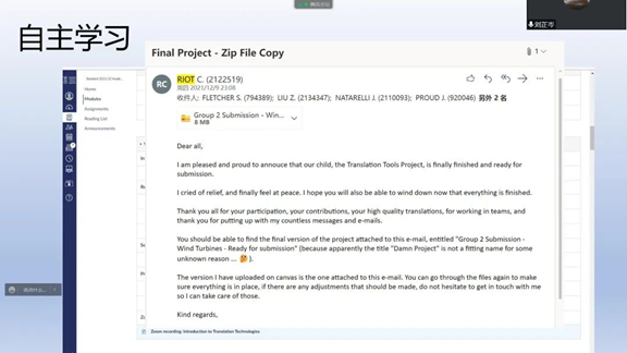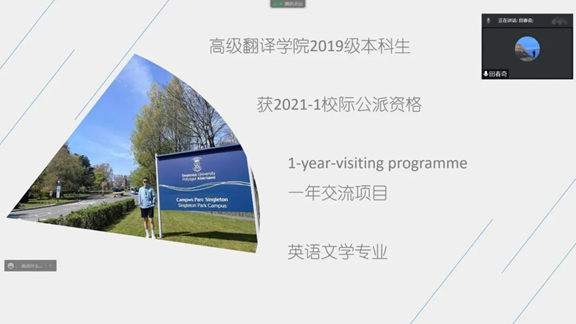 会议伊始,正于英国斯旺西大学交流学习的2020级英语口译研究生刘芷岑同学分享了她在英国自主学习、独立生活的感受,并讲述了英国教育与国内教育的差异。刘芷岑同学表示,通过海外留学生活,她能和当地人交流讨论,更好地了解当地文化。同在斯旺西大学学习的2019级本科生田春奇同学介绍了当地城市的文化,并分享了他在留学之前的准备以及在英国的日常生活。两位在校留学生对当地文化以及学习生活的讲述进一步丰富了同学们对斯旺西大学的了解,让同学们对自己的留学生活有了更多的期待。