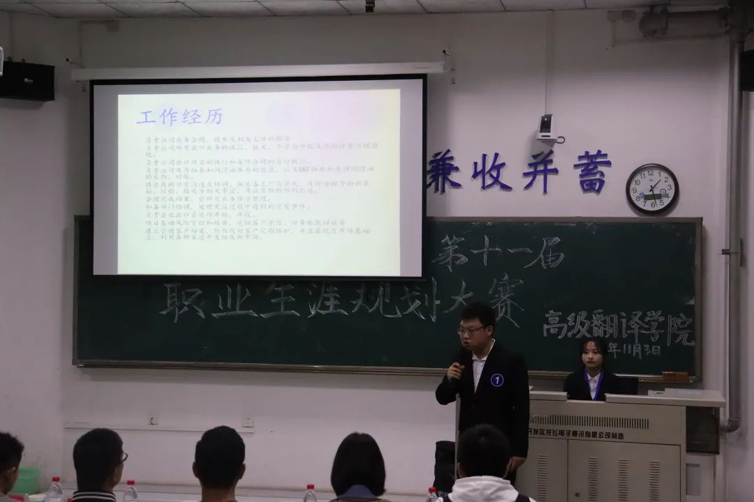 本次比赛分为个人简历展示和压力面试两个环节。在个人简历展示环节中,十位选手根据霍兰德职业分析报告,SWOT分析等理论,结合个人发展状况,进行了简洁介绍,突显了个人素养以及就业优势,锻炼了个人应试能力。1V1面试阶段,评委老师结合当前的就业形势以及每位选手的就业意向,对选手进行提问。选手们沉着冷静应对提问,逻辑紧密,条理清晰。比赛中场休息阶段,评委们公平公正地对选手的表现进行了打分,工作人员有条不紊地进行各项工作,展现出高翻学子自信昂扬的精神风采。