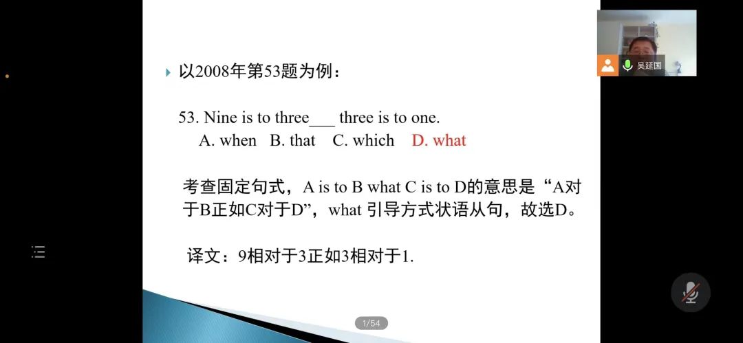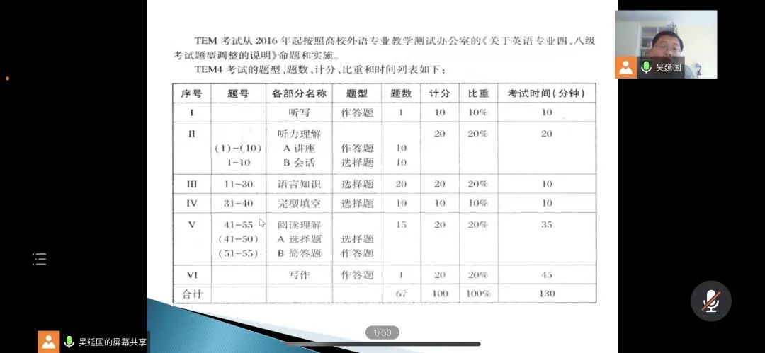 于11月10日下午在线上举办了英语专业四级考试讲座。本次讲座由吴延国老师主讲,围绕语言知识、完型填空、阅读三大基本题型,主要从题型特点、常见考点、答题技巧等方面进行讲述。2021级部分学生、2020级全体学生参与本次讲座。