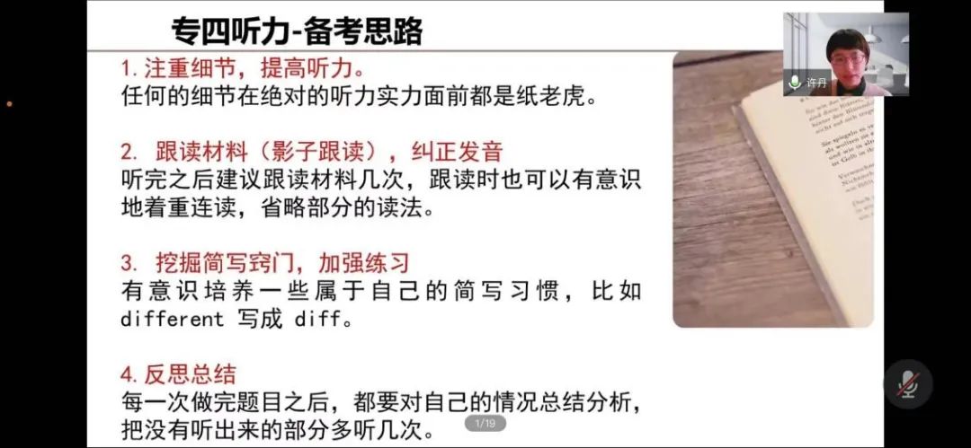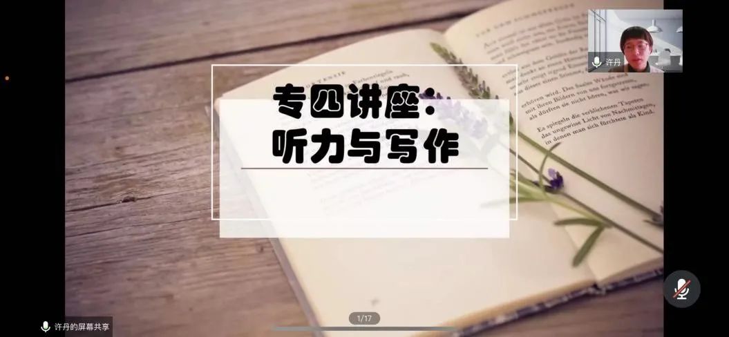 于线上举办了英语专业四级考试讲座。本次讲座由许丹老师主讲,旨在帮助同学们加强对听力与写作两大模块的理解,提升专业素养与能力,从而更好备考英语专业四级。许老师从听力与写作两大基本题型入手,针对常见错误点、扣分评分标准、备考思路、真题示例、优秀学生作品展示与讲解等部分展开讲座。2021级部分学生、2020级全体学生参与本次讲座。