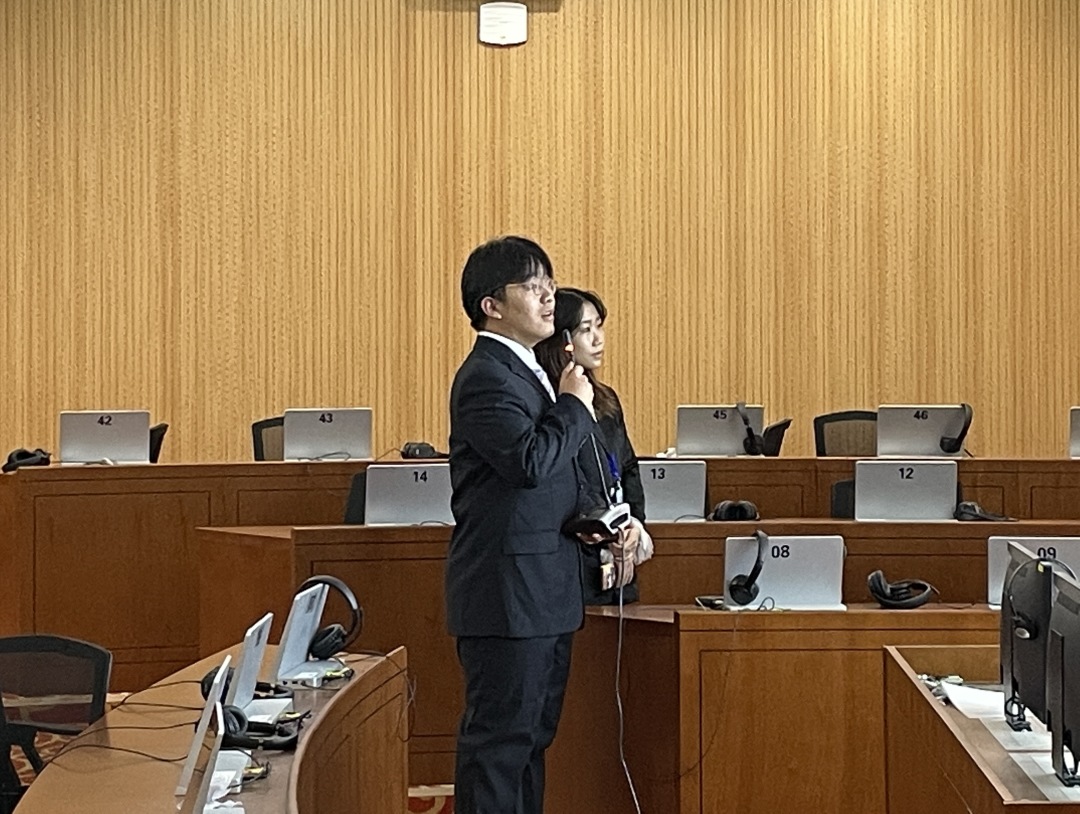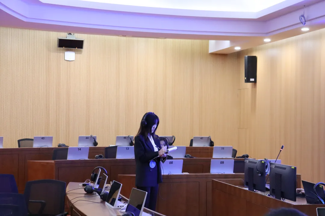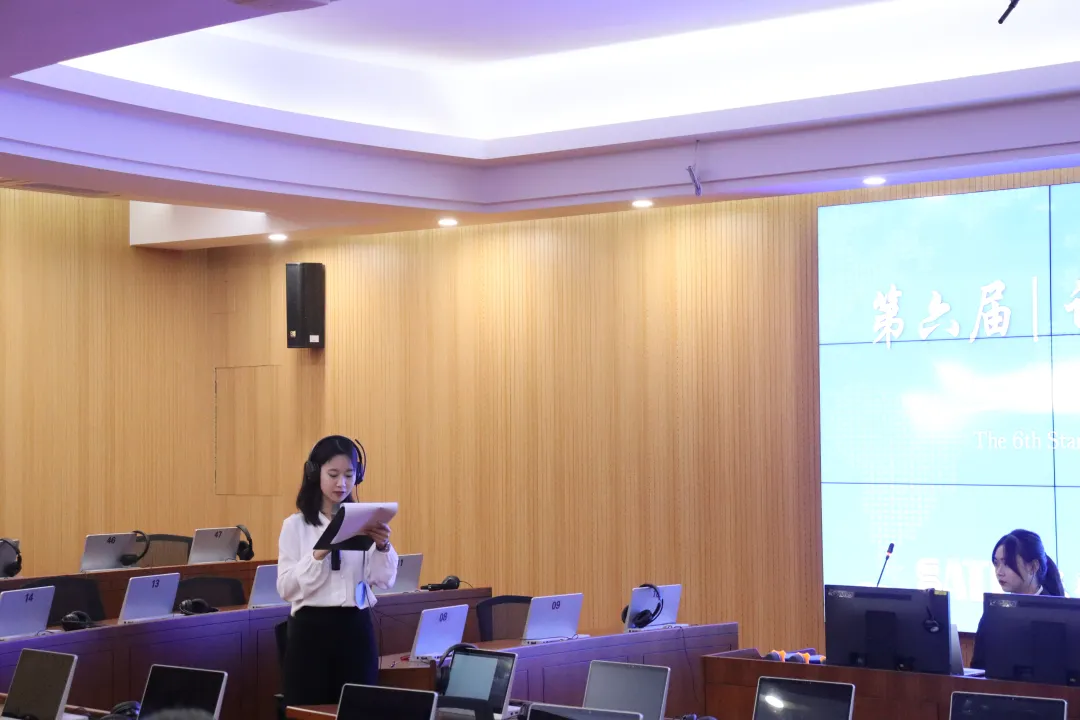 经过重重选拔,每年级各有6人脱颖而出,晋级到总决赛阶段。19级赛场以交替传译的形式开展;20级的赛场,以滚屏视译的形式开展;21级选手最后出场,比赛形式为屏幕视译。此次赛事翻译材料选材于专业性文本又不缺少时效性,需要选手们拓宽视野以便快速分析试题信息并组织语言,考查了选手们的英语综合素养。在比赛中,选手们面对多样的赛题从容不迫,思路清晰,阐述明确,展现了极高的现场表现能力以及脉络清晰的逻辑思维,凭借夯实的基础迅速应变并以流利的语音完成翻译。