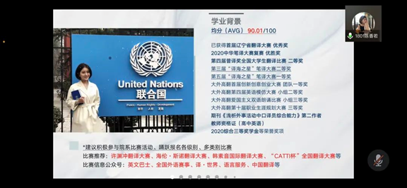 于线上举办了第七十期高翻主讲人活动,本次活动邀请到了陈香若同学作为主讲人,她以“联合国实习经历分享”为主题,向同学们进行了宣讲。