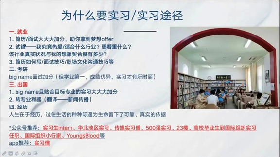 在本次活动中,陈香若同学首先向大家介绍了她在校期间丰富的校园活动。她建议同学们在兼顾学业的同时,多参加校园活动,开阔自己的眼界,锻炼社交能力。接着,她和同学们分享了抓住实习机会的方法并为同学们提供了获取实习信息的各种途径。陈香若同学还细致地为同学们讲解了实习简历的各项基本要求,为同学们进入实习岗位的第一步奠定了基础。她对每一次实习经历的尊重、珍惜与喜爱,实习中的精彩经历和经验,都使同学们受益匪浅。最后,陈香若同学分享了自己在联合国难民署的经历,包括多元的交流环境,同事间和谐有爱的相处方式,这为同学们打开了一个更加广阔的新世界。她表示,每一次实习机会都是来之不易的,同学们应对自己充满信心,勇于尝试,这不仅是为以后的工作生涯提供经验,同时这也是一个抉择就业方向的好机会。