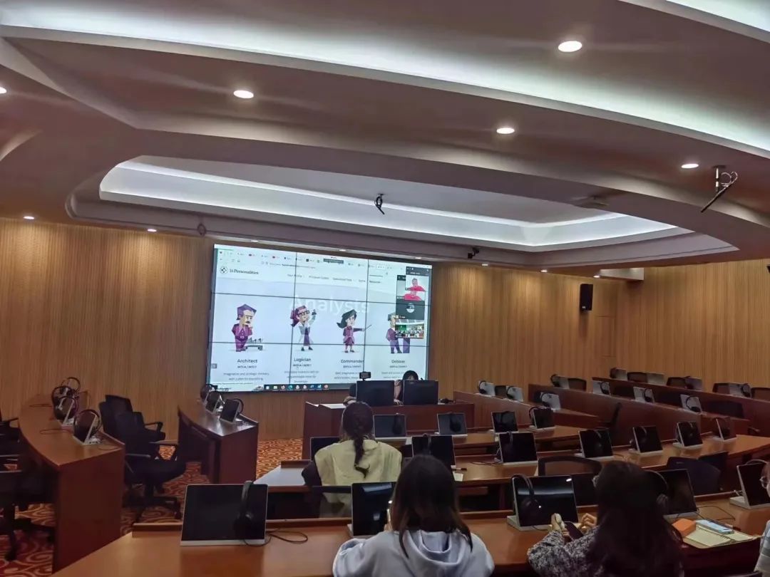 在励业楼5楼虚拟仿真口笔译实训中心顺利举办了第九期英语角活动,并邀请外教Daniel通过腾讯会议出席。本期英语角以“Explore Your Personality”为主题,同学们和Daniel在完成MBTI测试后,就各自的测试结果展开激烈的讨论,共同探索自己的个性特点。