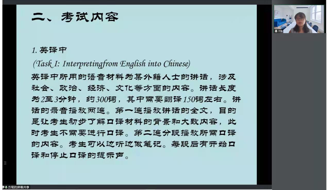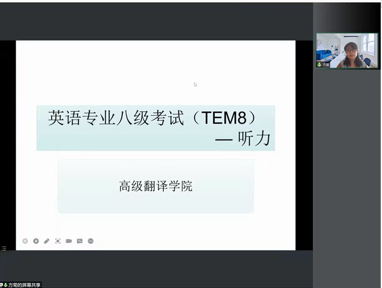 于11月25日下午在线上召开了专八笔试听力及口语答题技巧讲座。本次讲座由方菊老师主讲,围绕笔试听力和口语两大板块展开,主要从考试要求、考试流程和备考建议等方面进行讲述。2018级全体学生参与本次讲座。