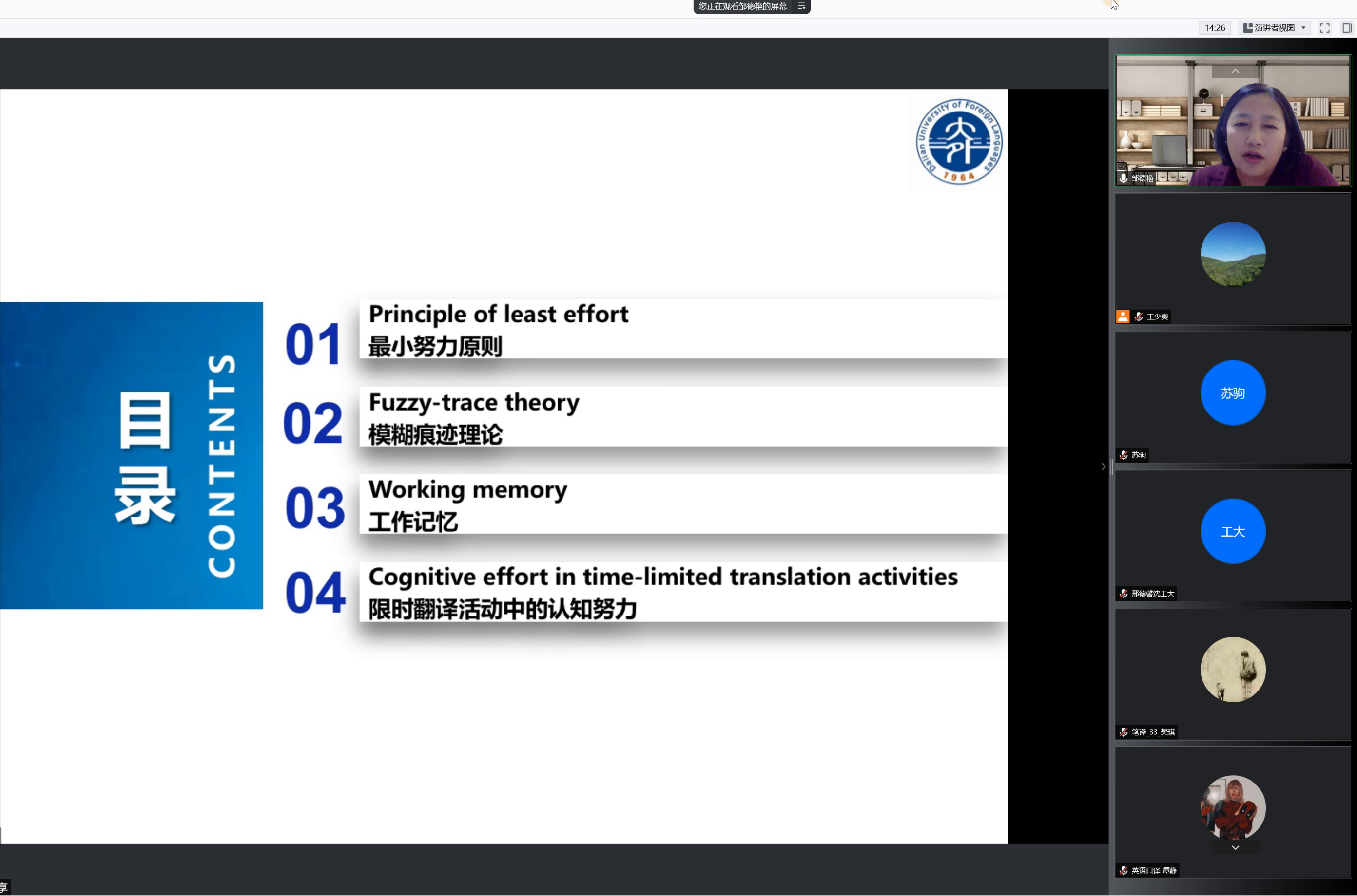 讲座伊始,邹德艳老师简要介绍了本期讲座的主要内容:最小努力原则、模糊痕迹理论、工作记忆、限时翻译活动中的认知努力。