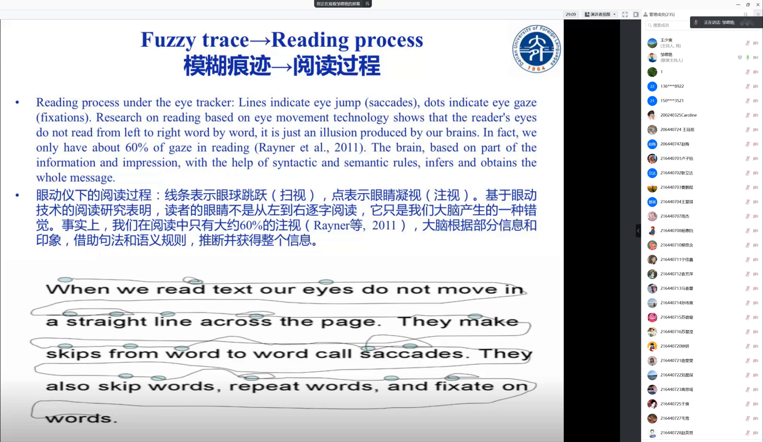 紧接着,邹老师结合实际案例,为大家形象地阐述了模糊痕迹理论——模糊加工偏好,说明受框架效应影响,相同信息,采用不同表达,会产生不同的决策判断。同时,在该理论框架下,邹老师分别对阅读过程和听解过程中的模糊处理表现进行生动而详细的讲解,并结合相关理论研究,表明翻译活动属于语言理解过程,而人类语言行为共性为理解人类语言行为本质提供可能性。