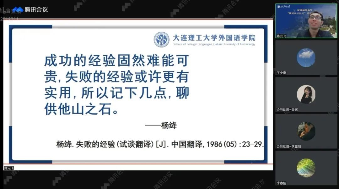 于5月7日线上开展翻译能力建设前沿学术讲座。陈元飞博士作为主讲人分享翻译研究成果,多校翻译讲师与2000余名同学参与本次讲座,互相分享学术经验。