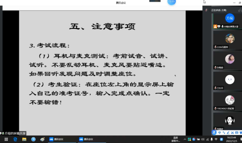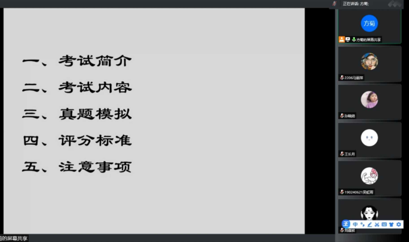 讲座伊始,方菊老师首先从考试的性质与目的、考试的时间与对象以及考试形式出发对专业八级考试做了简单的介绍,接着方老师对英译中,中译英,评论三部分的命题思路做了具体分析和讲解,让同学们明晰了备考方向。讲座期间,方菊老师带领同学们进行了真题模拟,使同学们对自己的能力水平有了大致的了解,为同学们后续的针对性练习提供了参考。接下来方老师根据自己的阅卷经验为同学们详细解读了全国英语专业八级口语考试的评分标准,以此来帮助同学们提高应试能力。此外,方老师还提示同学们要注意考试流程中的重要节点,旨在帮助同学们规避考试过程中可能出现的问题,从而保证考试顺利进行。最后,方菊老师督促大家在考前抓紧练习,做好充分准备,并预祝大家考试顺利。