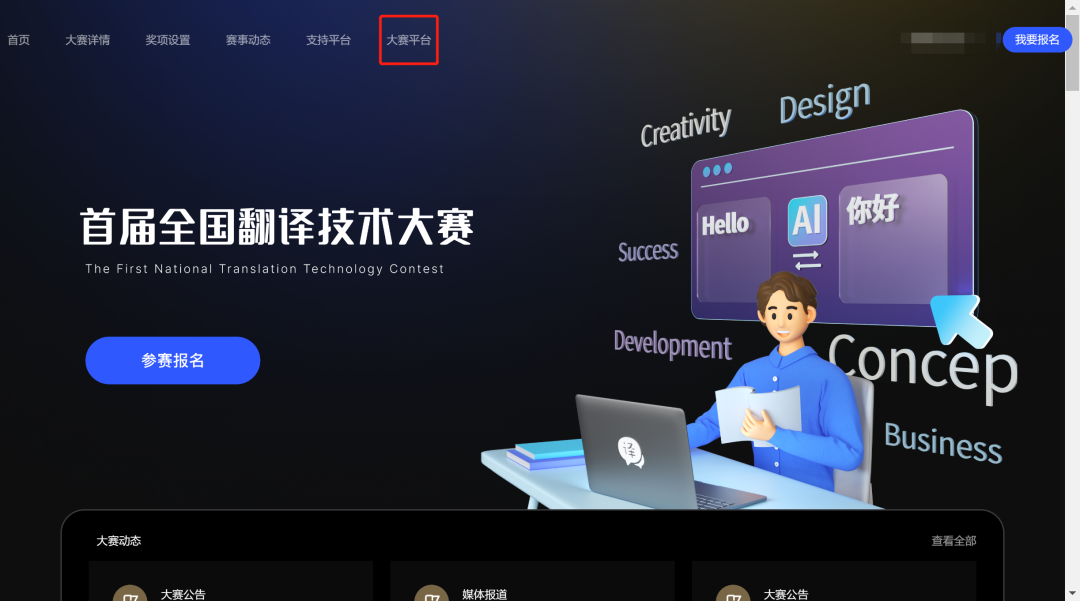 1.参赛者提前进入大赛官网(//fanyi.baidu.com/competition#/home),登录报名账号后,在网站界面上方点击“大赛平台”进行赛前准备。