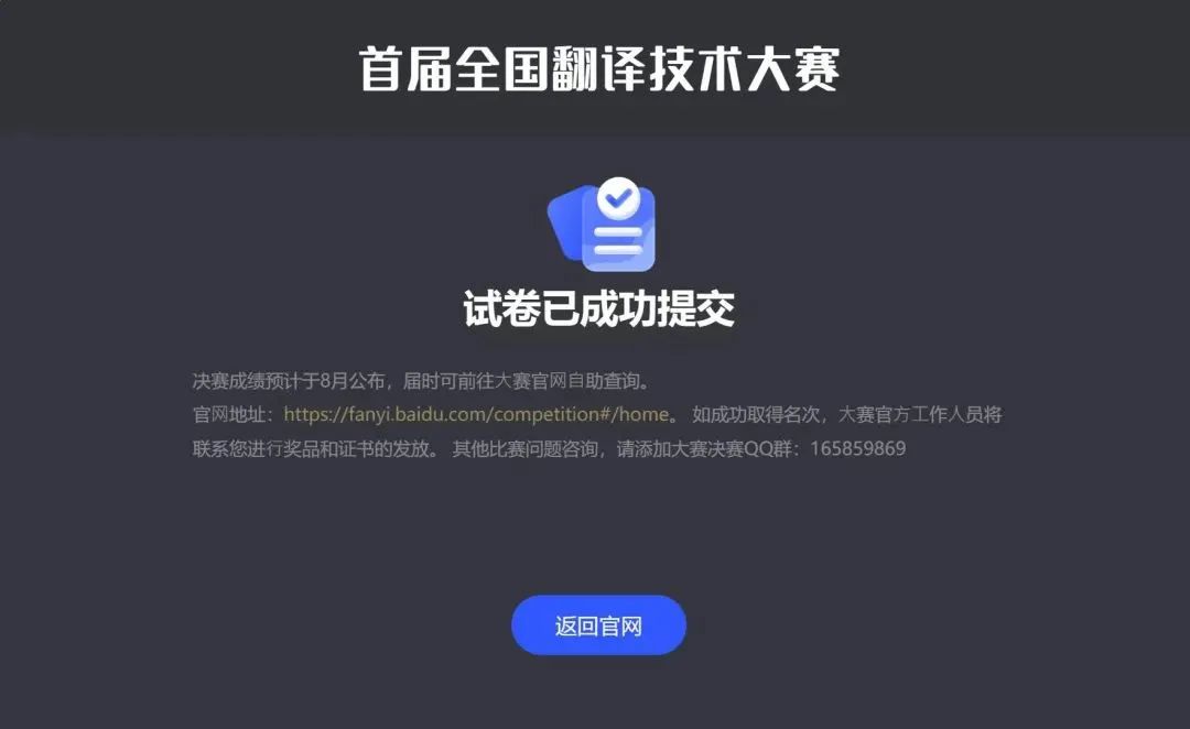 提交试卷后即自动退出考场。决赛成绩预计于8月公布,请各位参赛者及时关注大赛官网以及“中国翻译协会”“中国外文局翻译院”“中国外文局翻译院智能翻译实验室”“大外网上博彩平台推荐