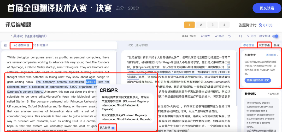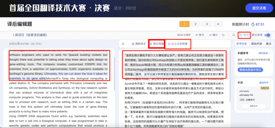 6.系统为参赛者提供译文替换、质量检查、原文划译、机翻参考、翻译记忆、术语参考、添加术语及自查标记等功能,参赛者可自由使用系统功能修改译文。