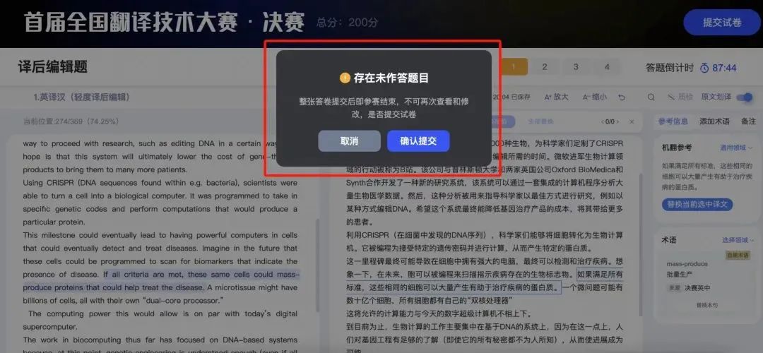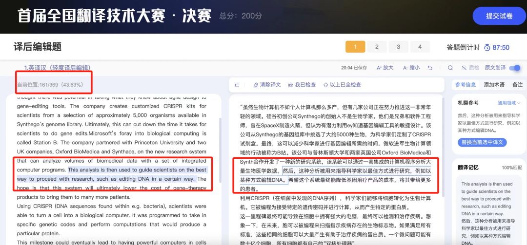 2.决赛系统已提供机器翻译译文,参赛者需在译文框内对机器翻译译文进行译后编辑。选中原文,译文框内会显示对应译文;选中译文,原文框内会显示对应原文。原文框上方会显示当前编辑位置与编辑进度。