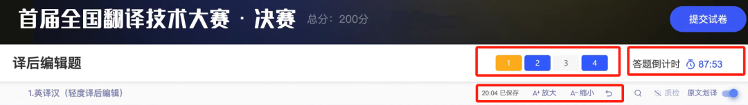 5.系统提供放大/缩小字体、译文清除、撤销修改等辅助功能,同时系统会自动保存参赛者作答数据。