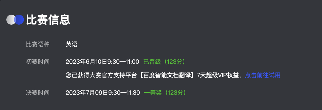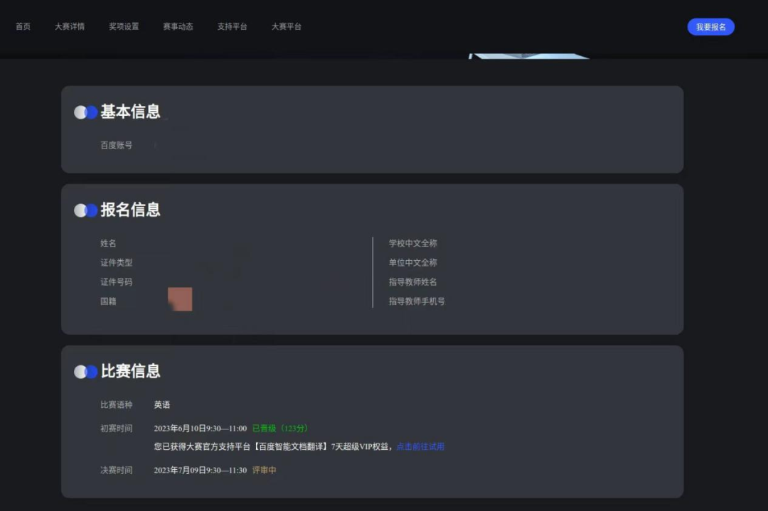 1.参赛选手进入大赛官网(//fanyi.baidu.com/competition#/home),登录个人账号后,将鼠标放置在个人账号处,点击下拉菜单栏进入“我的比赛”选项。