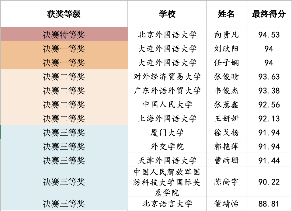 在上午的复赛阶段中,刘欣阳和任子娴均进入各分赛场前6名,获得复赛一等奖,并顺利晋级下午进行的决赛阶段。在决赛中,两位同学以流利稳定的输出和稳健的台风脱颖而出,以并列第二名的好成绩包揽决赛一等奖,我校也是所有参赛院校中唯一一所两名参赛选手均进入决赛的院校。